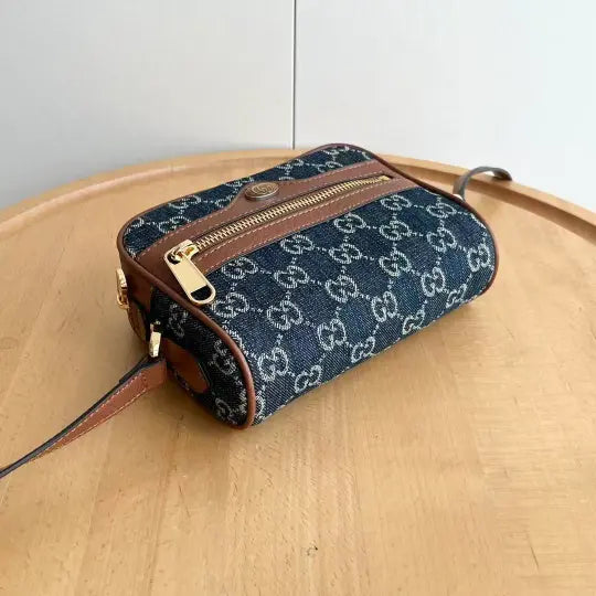 Dimensions: 17.5*12*5.5cm. Made of denim with a GG monogram pattern, accented with brown leather trim and gold-tone hardware. The bag is shaped like a camera bag and features a zip closure, a double G metal logo, and an adjustable leather shoulder strap.