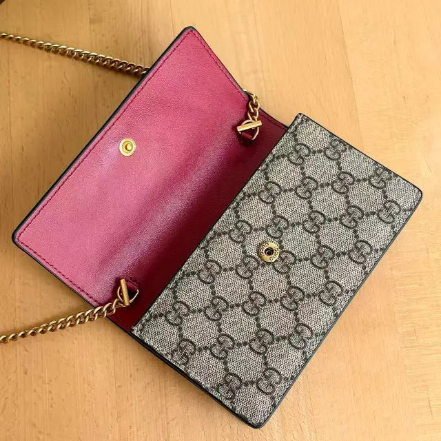 Dimensions: 16.5 x 10 x 3.5 cm. Features cherry decorations inlaid with three-dimensional crystals. Comes with a detachable chain shoulder strap and typically includes card slots or key chain clasps inside.