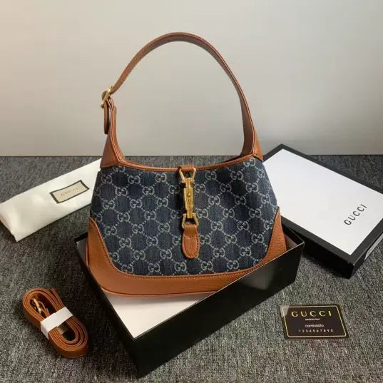 Dimensions: 28x19x4. Made of denim with the GG monogram pattern, featuring brown leather trim and gold-tone hardware. The iconic Jackie buckle (metal clasp) is highly recognizable. It comes with a detachable leather shoulder strap and a hobo style design.