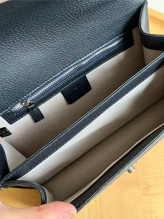 Dimensions: 25*17.5*7cm. Features gold-tone double G hardware on the front. Includes a top handle and a detachable shoulder strap for multiple carrying options. The interior typically contains zippered pockets and open pockets for easy organization of items.