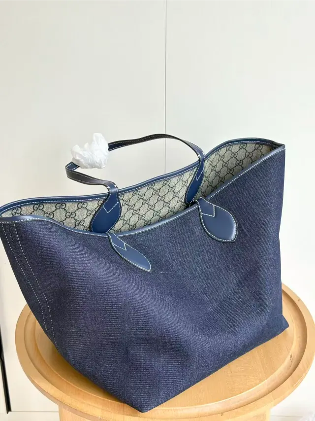 Dimensions: 30.5 x 28 cm x 27 cm. Featuring a dark blue leather handle and detailed embellishments, the overall style is casual yet sophisticated. The bag includes a detachable, matching leather storage pouch for easy organization of items.