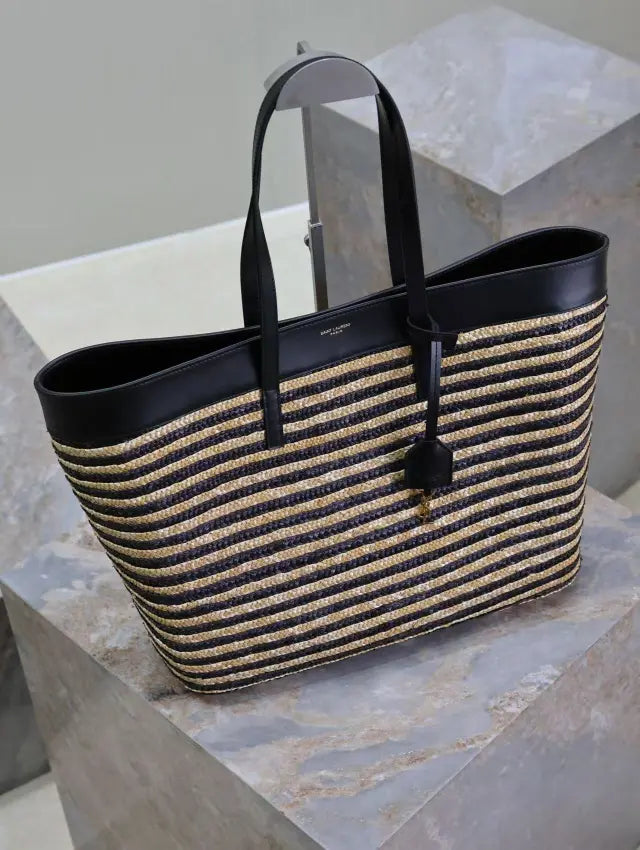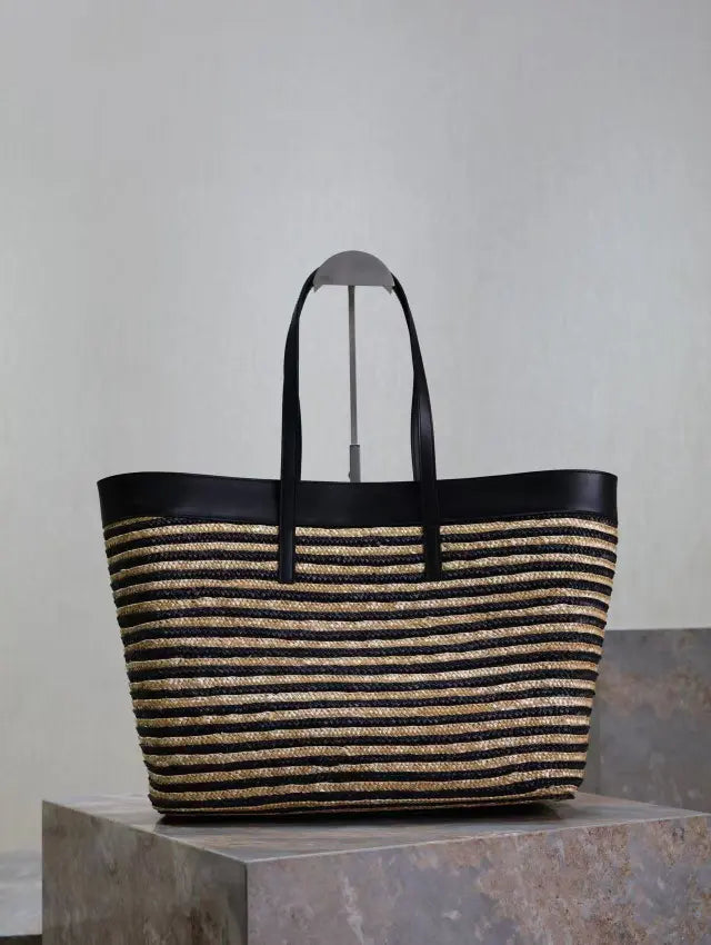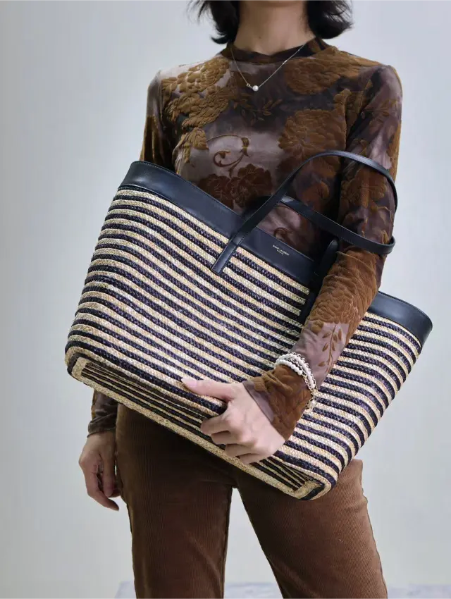 Size: 38x28x13cm. The design of this shopping bag combines casual and fashionable elements, aiming to create a handbag that is suitable for daily shopping and can also show a unique style in scenes such as vacation. The main part is made of straw material, showing a natural and rustic texture, creating a relaxed holiday atmosphere. The striped design adds a sense of visual layering and fashion. The edge of the bag and the handle are made of high-quality cowhide. After fine processing, the leather texture is soft and tough, wear-resistant and durable, and it also enhances the overall texture and grade. It adopts the classic tote bag shape, the bag body is wide, and the opening design is convenient for taking items. There is ample internal space to accommodate daily shopping items, books, laptops, etc., to meet various storage needs.
