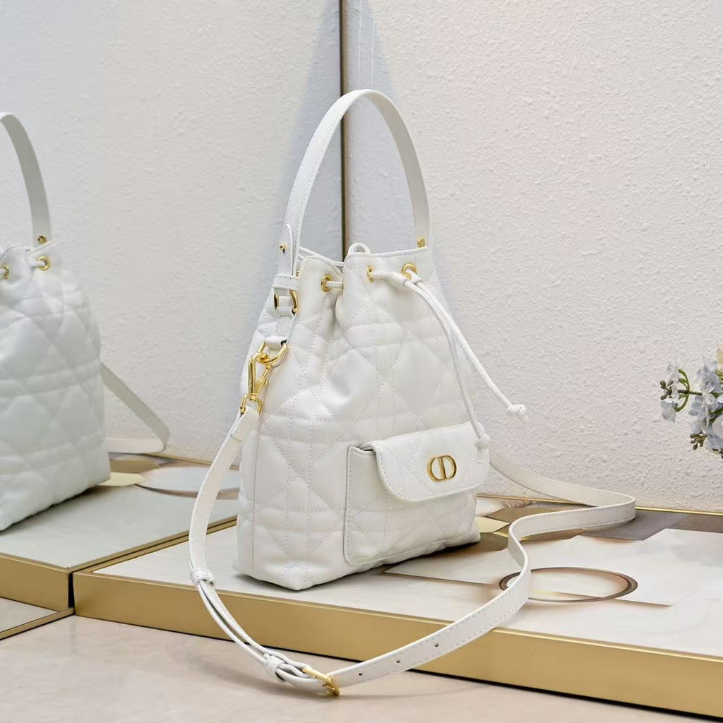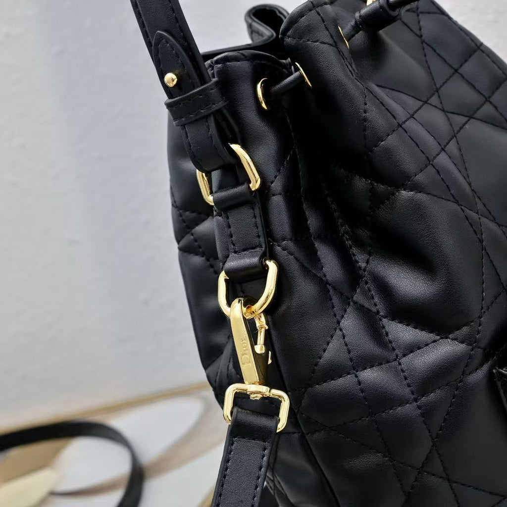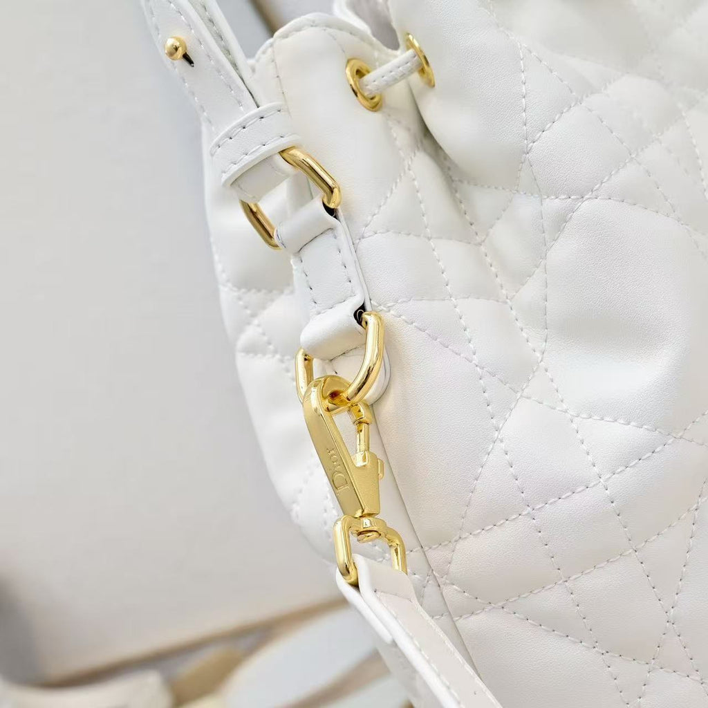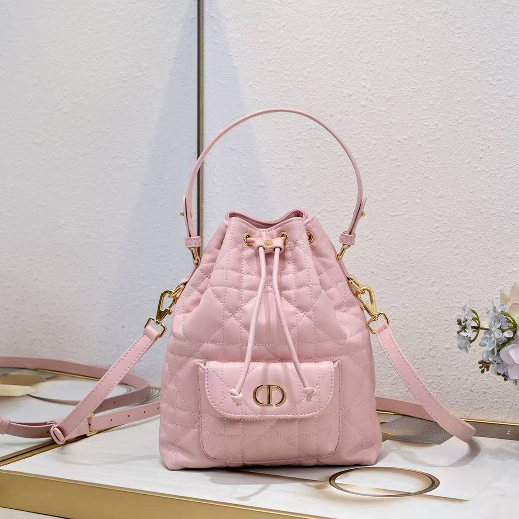 Dimensions: 20 x 24 x 9 cm. Featuring a classic bucket shape, the bag is adorned with Di*r signature CD logo hardware on the front, instantly recognising the brand's identity. Made from premium leather, it boasts a soft, lustrous finish and exceptional durability. Hardware, such as the CD logo and the metal buckle at the shoulder strap, are crafted from high-quality metal, creating a vibrant, resistant-to-fading and wear-and-tear finish, further enhancing the bag's luxurious feel.