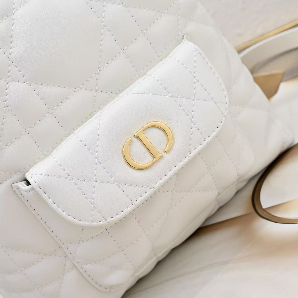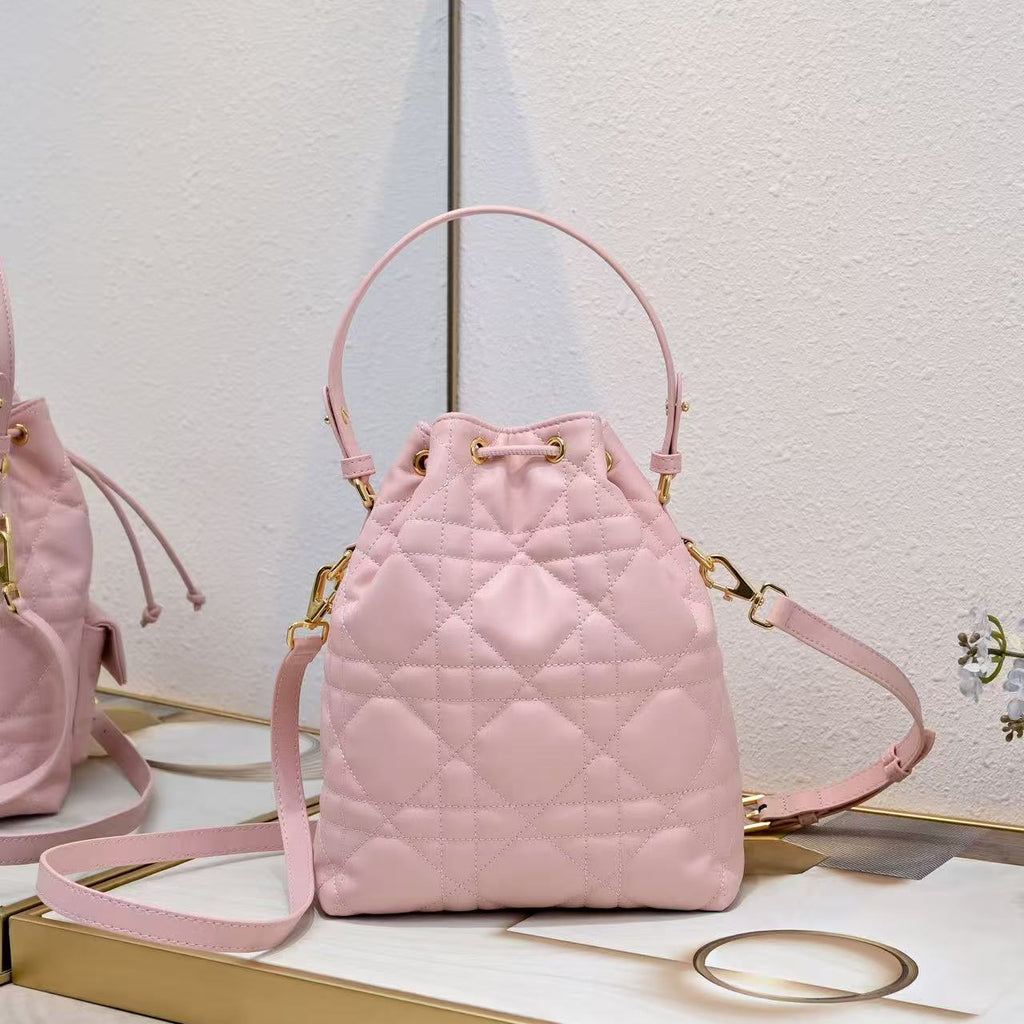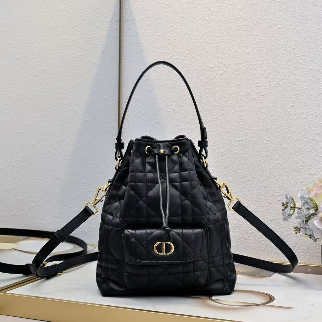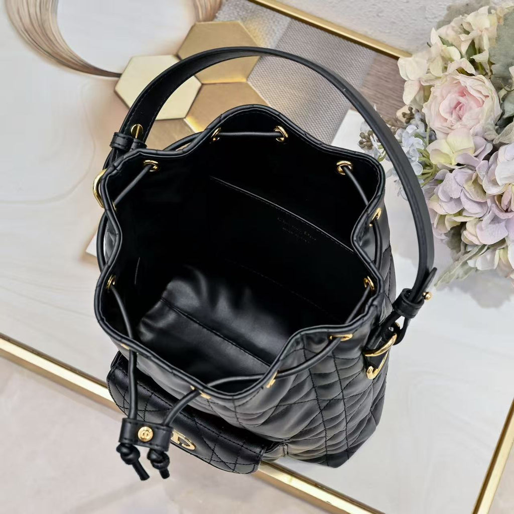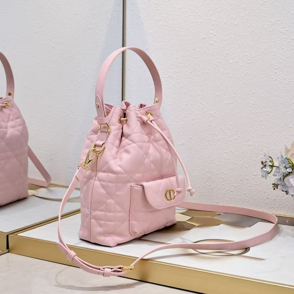 Dimensions: 20 x 24 x 9 cm. Featuring a classic bucket shape, the bag is adorned with Di*r signature CD logo hardware on the front, instantly recognising the brand's identity. Made from premium leather, it boasts a soft, lustrous finish and exceptional durability. Hardware, such as the CD logo and the metal buckle at the shoulder strap, are crafted from high-quality metal, creating a vibrant, resistant-to-fading and wear-and-tear finish, further enhancing the bag's luxurious feel.