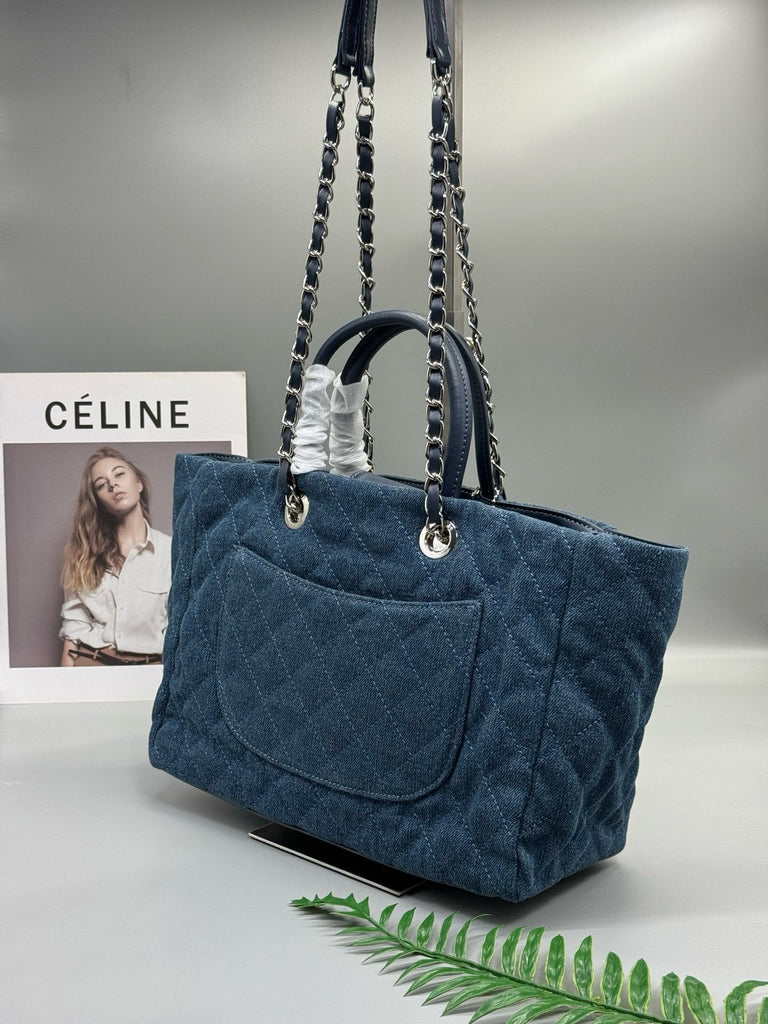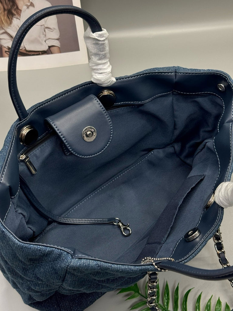 Large size (35*25*15cm), 50cm opening. Made of denim, featuring the brand's signature quilted design and double C metal buckle, blending casual and luxurious styles. The bag has a large capacity and can be carried by hand or over the shoulder.