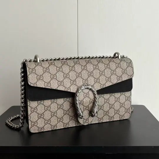 Size: 28x18x9cm. Made of classic GG Supreme canvas with black leather trim and a metal Dionysus buckle, and comes with a metal chain shoulder strap for wearing over the shoulder or crossbody.