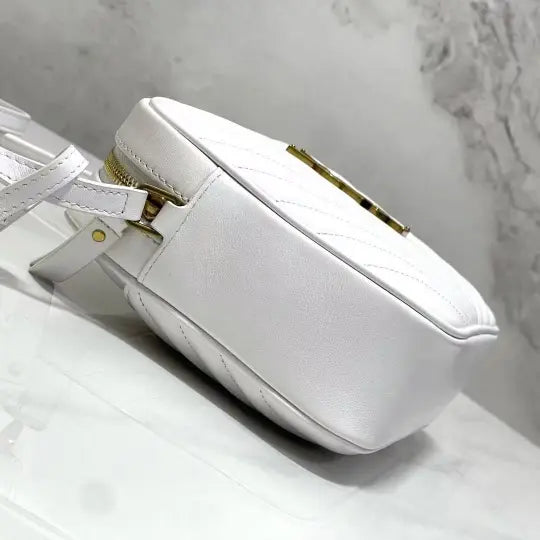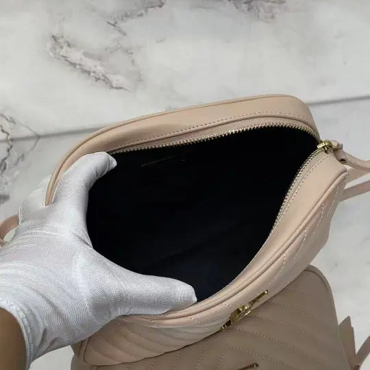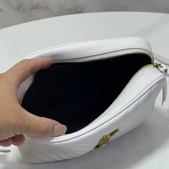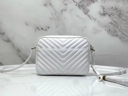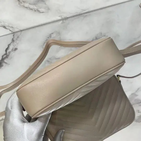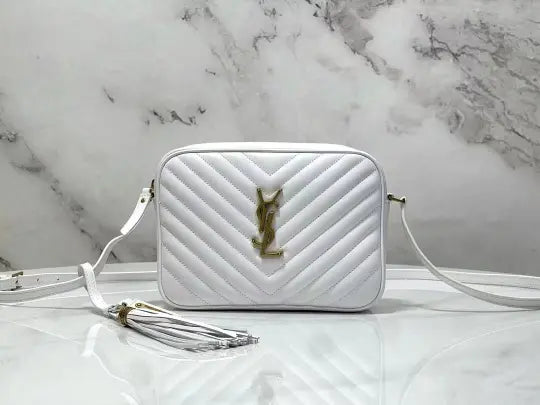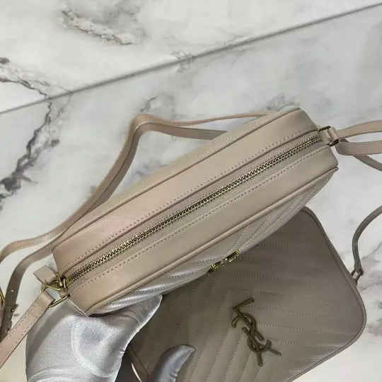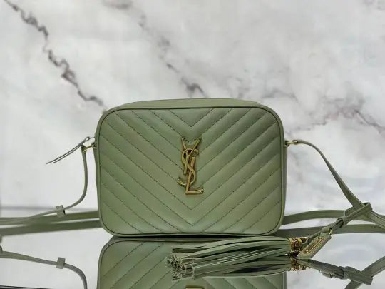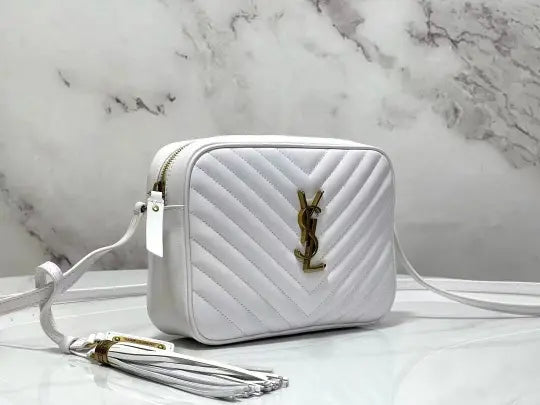 Dimensions: 23x16x6cm. The bag features the classic Lou camera bag twill quilting, creating a layered and three-dimensional effect. The front features the iconic Y*L gold metal logo, adding a refined touch and a distinctive hallmark of the Lou collection. The bag's rectangular shape aligns with the signature Lou camera bag style, and the shoulder strap design is consistent with common Lou camera bag styles, allowing it to be carried over the shoulder or across the body. The twill quilting complements the gold Y*L logo, making it instantly recognizable. The bag typically features multiple compartments and pockets for storing essentials such as a phone, wallet, and cosmetics. The shoulder strap is adjustable to accommodate various carry styles.